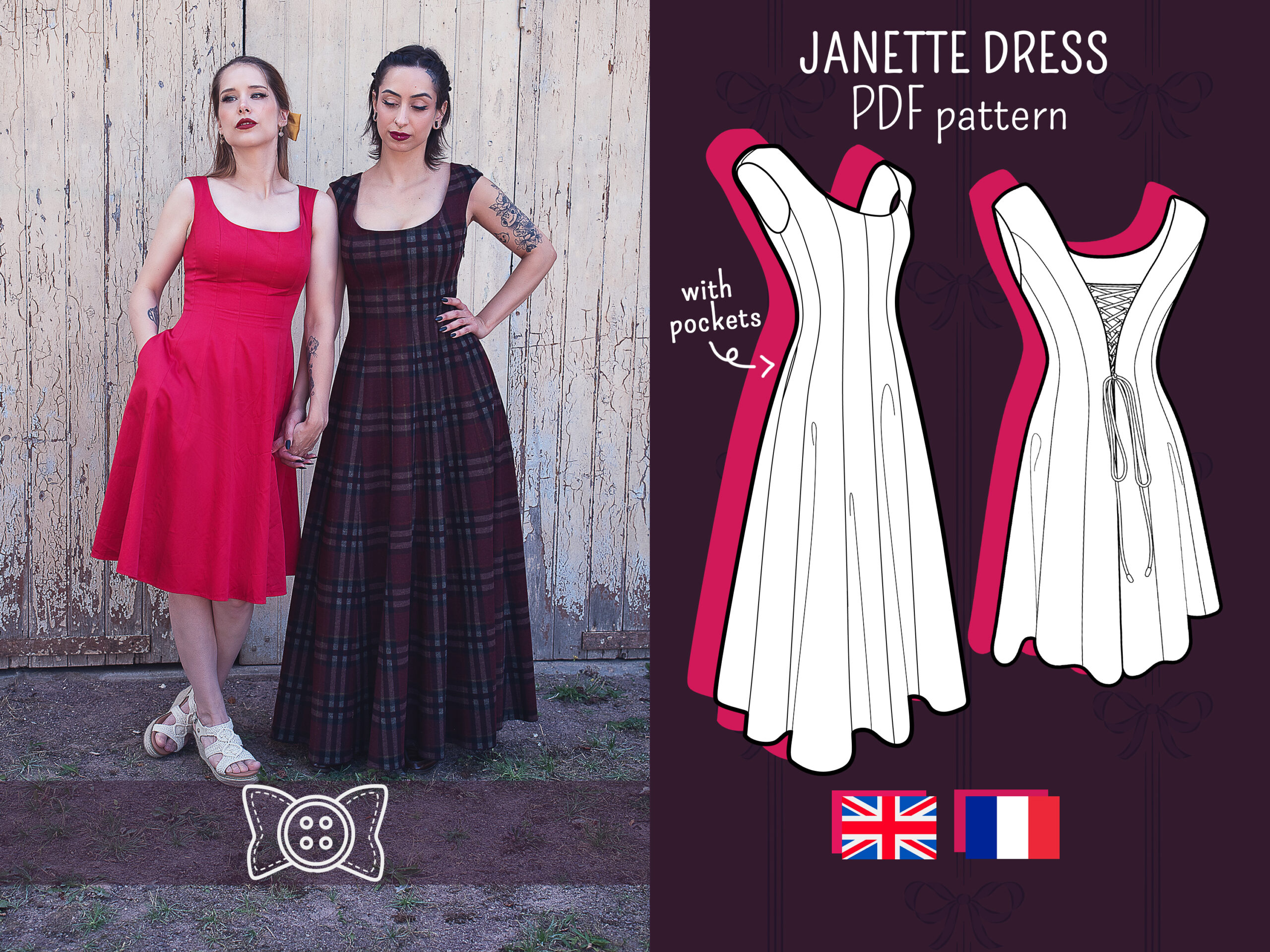 This elegant PDF sewing pattern features a flattering fitted bodice, a twirl-worthy flared skirt, practical side pockets, and a romantic lace-up back. Available in two lengths (midi & maxi), the Janette Dress blends vintage charm with everyday comfort.
